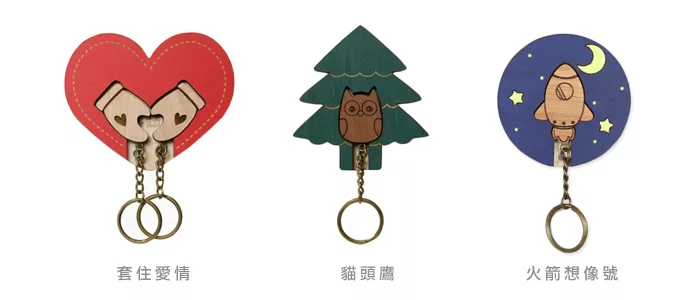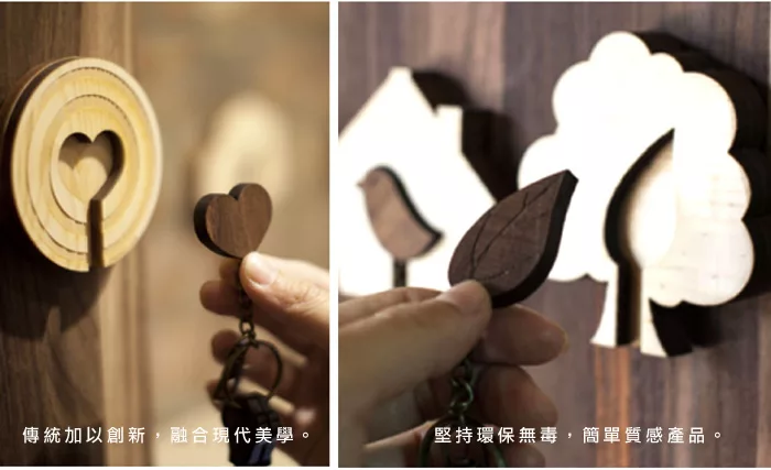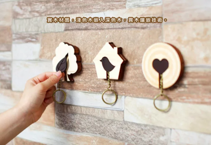 結合了台灣傳統工藝──異木鑲嵌技術,以兩種不同材質之木料搭配,淺色木嵌入深色木中,再加上現代雷射加工技術重新設計出KEY HOUSE。希望給還在流浪的你一個屬於鑰匙的家!木頭的質感,放在門口,回家時就可以掛上,出門時再也不用擔心自己找不到鑰匙了!?